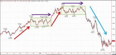 勝つためにはトレンドを把握することが最も重要 テクニカル分析の基礎 2014年03月22日 テクニカル分析を行う上での基礎でもあり、 なお且つもっとも重要なトレンドについて解説していきます。 トレードで勝つための必要条件、それは「トレンドに従うこと」です。 相場のトレンドを読み解くことができれば、効率的な投資を 行うことができるようになり、勝率や利益幅も格段に上がります。 ≪トレンドとは?≫ 一般的には、トレンドとは相場の流れ=方向を意味します。 相場には「右肩上がり」、「右肩下がり」、 「一定の幅を行ったり来たりする横ばい」の3つ流れがあります。 テクニカル分析では、これらの相場の方向性を示すのに、 「トレンド」という言葉が使います。 つまり、右肩上がりの相場なら「上昇トレンド」、 右肩下がりなら「下降トレンド」、 横ばい相場なら「横ばいトレンド」、又は「ボックス」と呼ばれます。 〈相場を構成する3つのトレンド〉 ・右肩上がり=上昇トレンド ・右肩下がり=下降トレンド ・一定の幅を行ったり来たりする横ばい=横ばいトレンド、ボックス このトレンド(値動きの方向性)を把握するための最も一般的な方法は チャートに移動平均線を表示させたり、 チャート上に「トレンドライン」という線を引く方法です。 トレンドの把握方法ついてはまたご紹介しますが、 まずは下記のチャートを見ながら、相場には3つの流れ(=トレンド)が あることをしっかりイメージして下さい。 ≪参考チャート EUR/USD 日足チャート≫ この時期は、サブプライム問題が顕在化し、 世界の金融市場が大混乱に陥った後の修正局面から、 リーマンショックで未曾有の大暴落に見舞われるまでのものです。 チャートに示した矢印の通り、 上昇(赤)、下降(水色)、横ばい (紫色)のトレンドで、 相場が構成されていることが分かると思います。 また、上昇相場の中にも小さな下落相場があり、 横ばい相場の中には上昇相場や下落相場が見る事ができます。 ※「小さなトレンドサイクルの積み重ね」が「大きなトレンドを形成」する。 「大きなサイクル」の中に「小さなトレンドが形成」する。 これらトレンドの継続性や、上昇、下落の角度の変化などを 分析することで、トレードの精度を高める事ができます。 また、上記チャートのように、ひとたびトレンドが発生すると、 数ヵ月、時には数年にわたって、そのトレンドが継続する特徴がある為、 FX取引においてはトレンドを見極めることが最も重要な事だと言えます。 PR