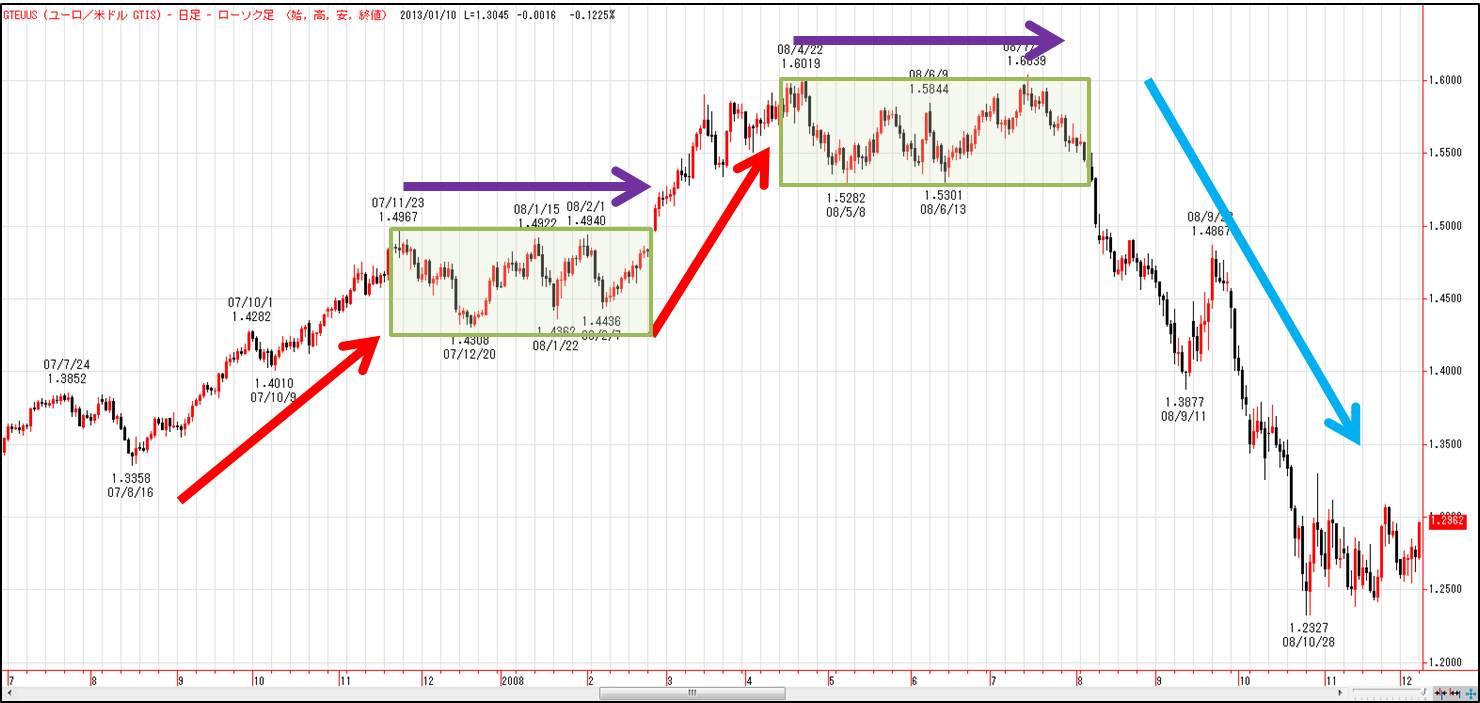 勝つためにはトレンドを把握することが最も重要 テクニカル分析の基礎 2014年03月22日 テクニカル分析を行う上での基礎でもあり、 なお且つもっとも重要なトレンドについて解説していきます。 トレードで勝つための必要条件、それは「トレンドに従うこと」です。 相場のトレンドを読み解くことができれば、効率的な投資を 行うことができるようになり、勝率や利益幅も格段に上がります。 ≪トレンドとは?≫ 一般的には、トレンドとは相場の流れ=方向を意味します。 相場には「右肩上がり」、「右肩下がり」、 「一定の幅を行ったり来たりする横ばい」の3つ流れがあります。 テクニカル分析では、これらの相場の方向性を示すのに、 「トレンド」という言葉が使います。 つまり、右肩上がりの相場なら「上昇トレンド」、 右肩下がりなら「下降トレンド」、 横ばい相場なら「横ばいトレンド」、又は「ボックス」と呼ばれます。 〈相場を構成する3つのトレンド〉 ・右肩上がり=上昇トレンド ・右肩下がり=下降トレンド ・一定の幅を行ったり来たりする横ばい=横ばいトレンド、ボックス このトレンド(値動きの方向性)を把握するための最も一般的な方法は チャートに移動平均線を表示させたり、 チャート上に「トレンドライン」という線を引く方法です。 トレンドの把握方法ついてはまたご紹介しますが、 まずは下記のチャートを見ながら、相場には3つの流れ(=トレンド)が あることをしっかりイメージして下さい。 ≪参考チャート EUR/USD 日足チャート≫ この時期は、サブプライム問題が顕在化し、 世界の金融市場が大混乱に陥った後の修正局面から、 リーマンショックで未曾有の大暴落に見舞われるまでのものです。 チャートに示した矢印の通り、 上昇(赤)、下降(水色)、横ばい (紫色)のトレンドで、 相場が構成されていることが分かると思います。 また、上昇相場の中にも小さな下落相場があり、 横ばい相場の中には上昇相場や下落相場が見る事ができます。 ※「小さなトレンドサイクルの積み重ね」が「大きなトレンドを形成」する。 「大きなサイクル」の中に「小さなトレンドが形成」する。 これらトレンドの継続性や、上昇、下落の角度の変化などを 分析することで、トレードの精度を高める事ができます。 また、上記チャートのように、ひとたびトレンドが発生すると、 数ヵ月、時には数年にわたって、そのトレンドが継続する特徴がある為、 FX取引においてはトレンドを見極めることが最も重要な事だと言えます。 PR